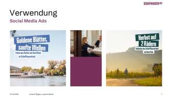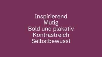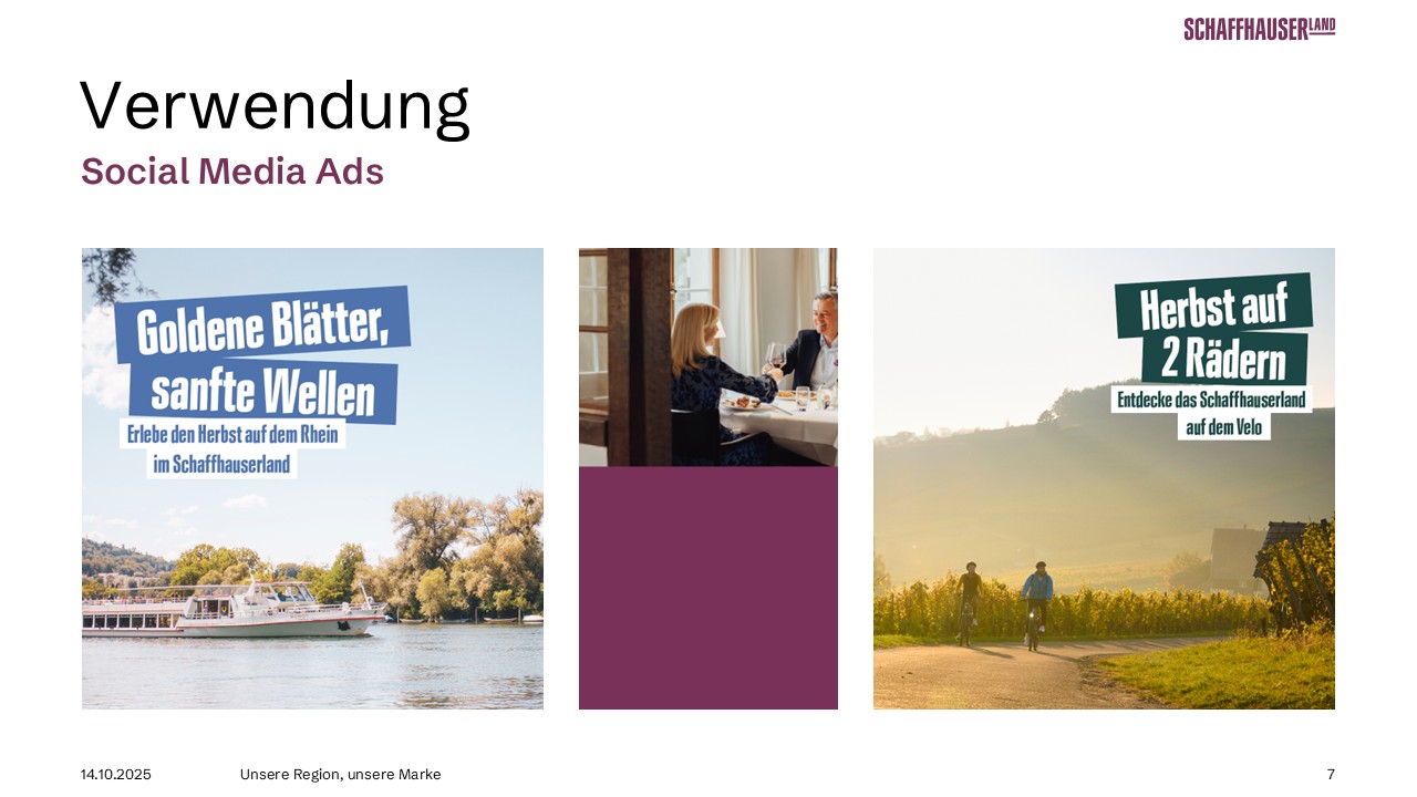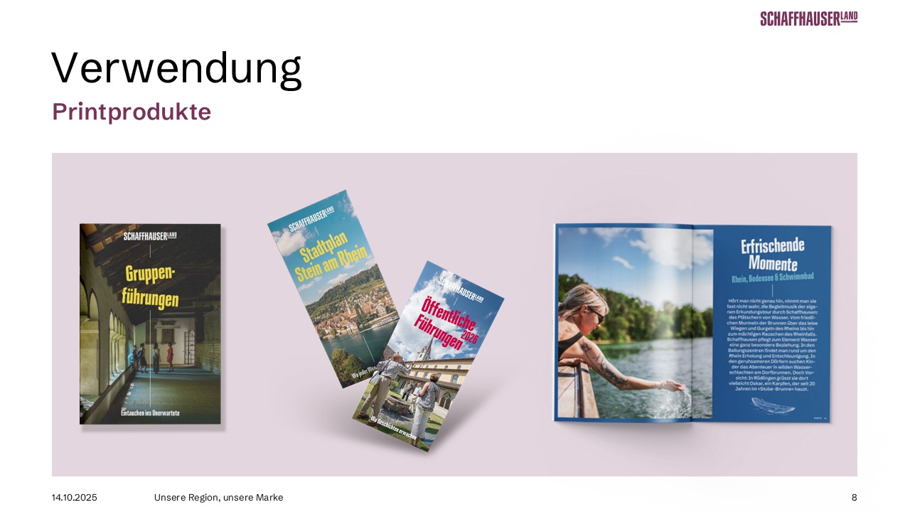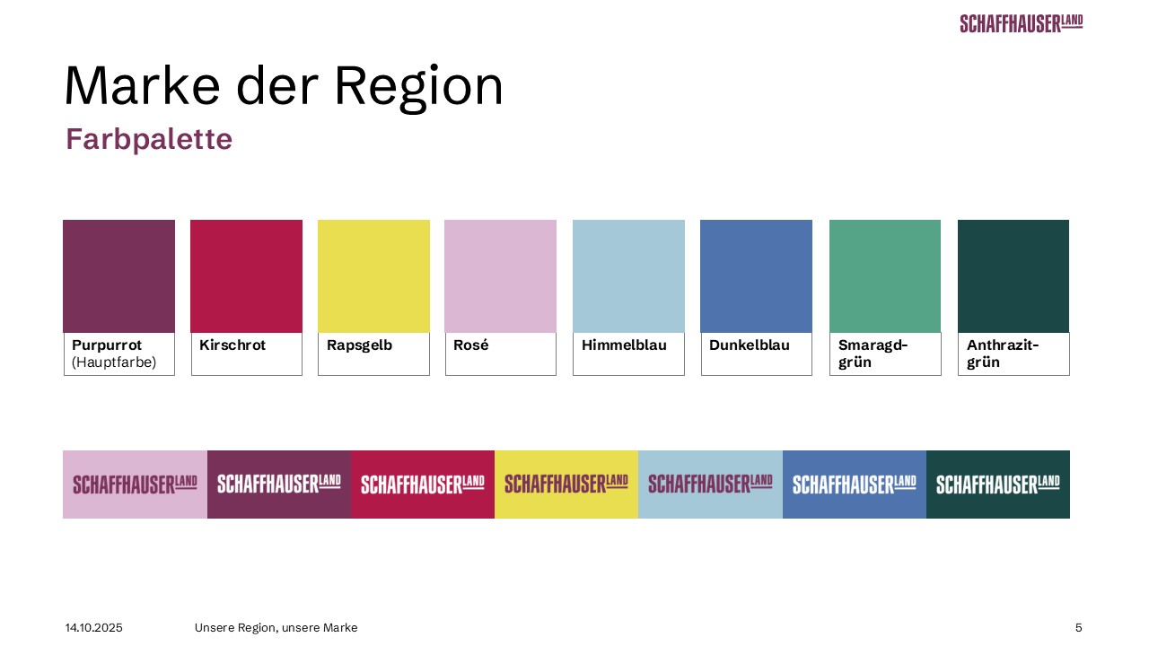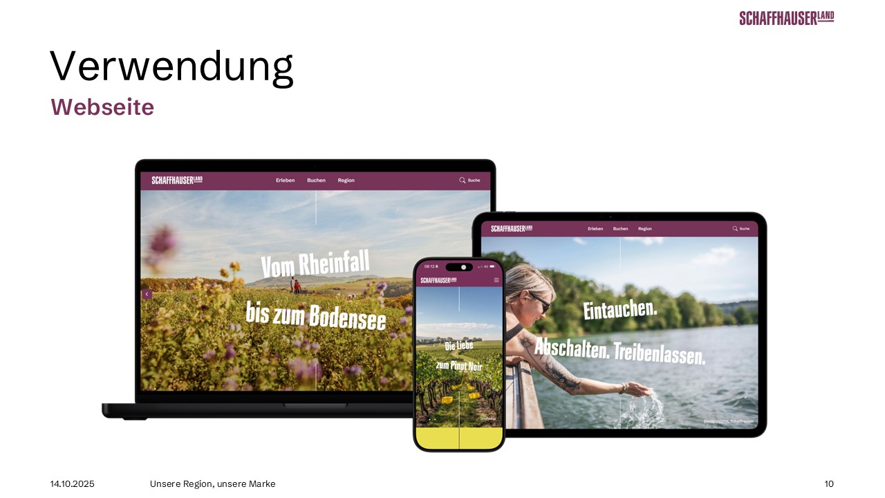 Der neue Markenauftritt ist inspirierend, mutig, kontrastreich und selbstbewusst. Die moderne, minimalistische Typografie hebt sich klar von anderen Regionen ab. Authentische Bildwelten und verspielte Texte schaffen Nähe, wecken Emotionen und erzählen Geschichten – so einzigartig wie unsere Region selbst. Die neue Farbwelt spiegelt die Vielfalt des Schaffhauserlands wider und setzt auf starke Kontraste. Das Purpurrot bildet dabei die Primärfarbe.
